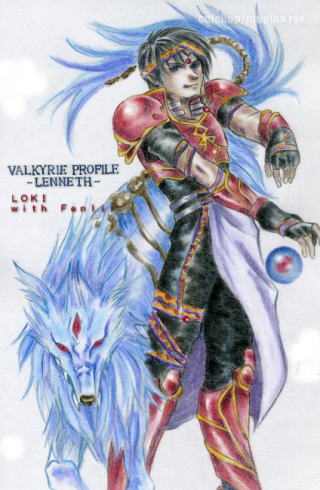 ヴァルキリープロファイル−レナス−から ロキ&フェンリル。 北欧神話では最強・最凶・最狂の魔物、フローズンヴィトニルことフェンリルですが、「弱点炎」のおかげで最終ボス直前の中ボスのくせに某炎剣で即死という…。 VP中でも影薄かったけれどお気に入りなのでご主人様(父親?)と一緒に描いてみました。 神話上でもVPでもメガテンでもロキ様ラヴ!なのです。